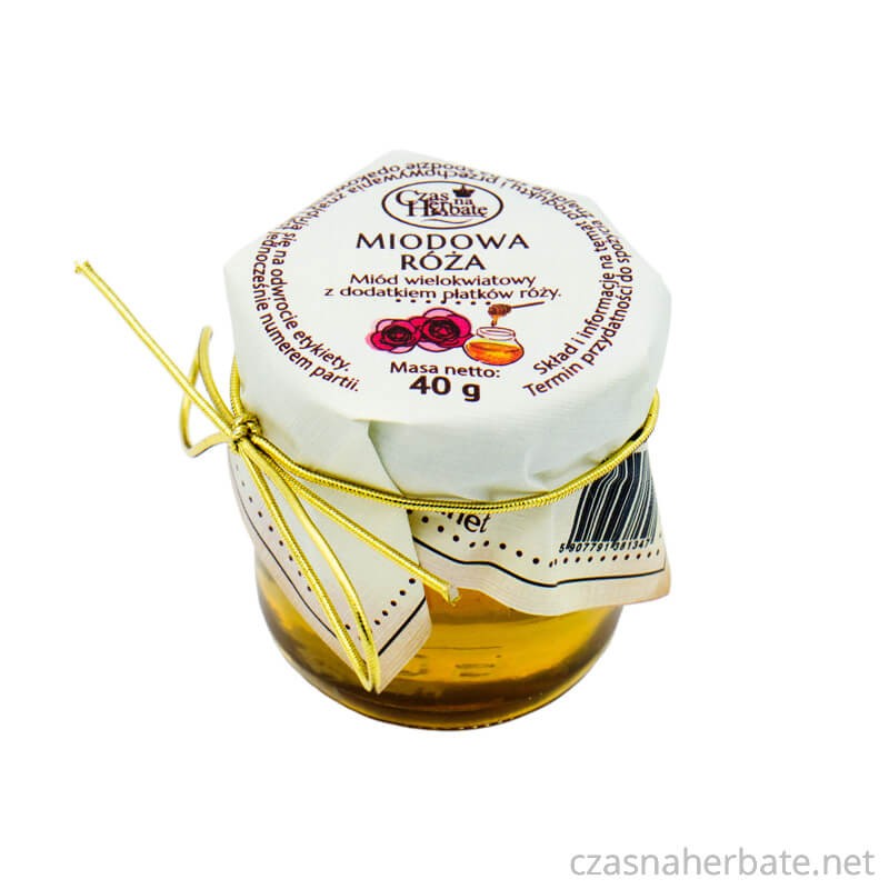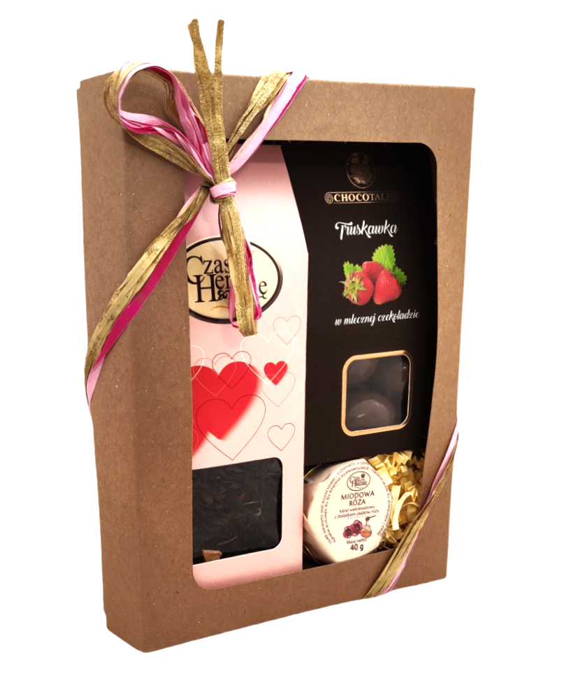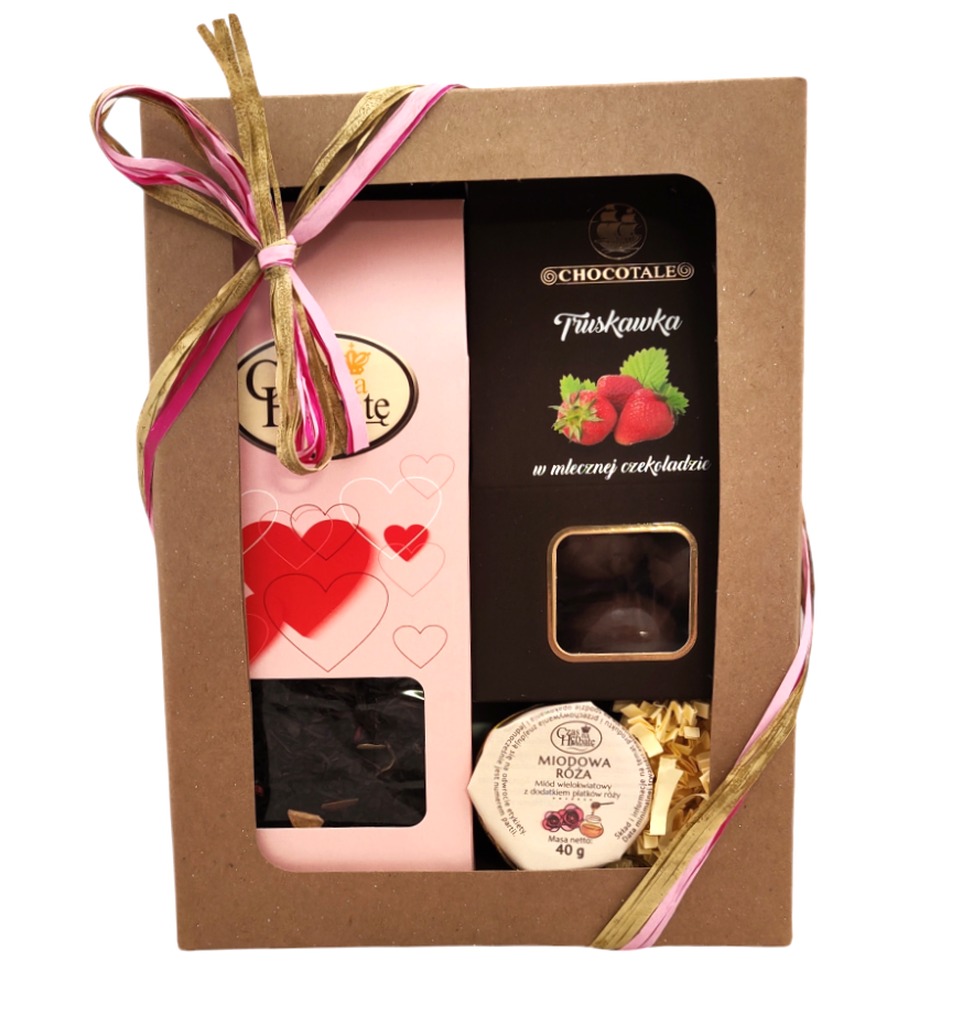 Zestaw prezentowy zawierający herbatę, bakalie oraz smakowy miód.