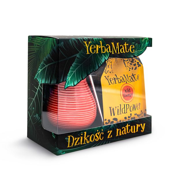 Zestaw składający się z Yerba Mate Wild Energy 400g (połączenia Yerba Mate, guarany i żeń-szenia, które doda nowych sił do działania, a soczysty ananas, maliny i aromatyczna skórka pomarańczy apetycznie dopełni całości), ceramicznego czerwonego matero oraz bombilli.