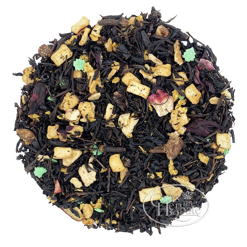 Skład: herbata czarna OP, choinki cukrowe (cukier, mąka ryżowa, olej roślinny (słonecznikowy), skrobia ziemniaczana, aromat, barwnik), jabłko suszone, pomarańcza trójkąty, gruszka liofilizowana, goździk, cynamon, hibiskus, śliwka suszona, aromat.
